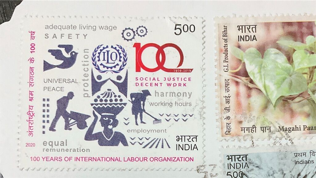 切手もなんか面白い。ILO(国際労働機関)発足100年を記念するもののようです。